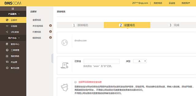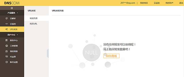开启邮箱验证,验证之后方可添加域名,点击我的域名进入域名添加页面。一次性可添加300个域名,添加域名长度与后缀不受限制,轻松录入一步到位。录入完成后设置正确域名记录值,域名添加easy done。URL转发功能是此次新增加的一个服务,在产品中心栏目找到,点击进去提示我们进入商城购买。进入商城,先在下图框中输入添加域名。重大发现横空出世!DNS.COM2.0版本新增自定义购买方式。自定义选择购买方式更加自由,按需购买,贴近消费需求。