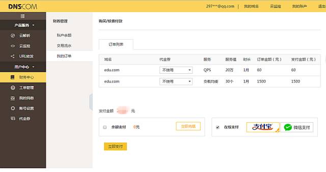 页面跳转至财务中心——我的订单。又一个新功能——列表可详细看到所购买的各项服务,服务值,时长,订单金额,支付金额。支付的时候可选择第三方支付、账户余额支付或者汇款支付方式。支付过程中如果有我们的代金券可以带来不小的折扣哦!