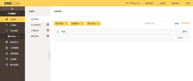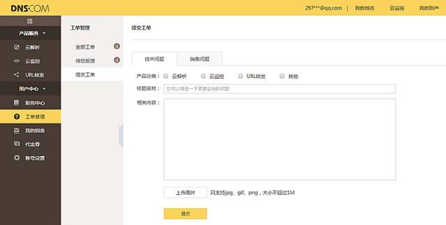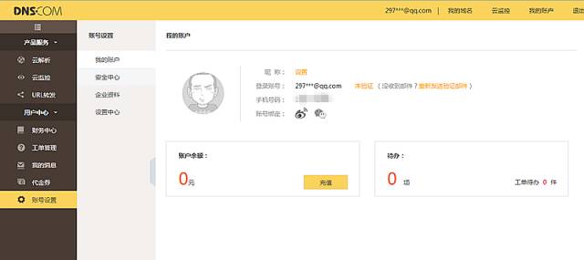 第一步,点击www.dns.com 进入主页,注册之后登录账户。登录我的账户页面 ,可以看到崭新的页面、产品设计。2.0版本产品架构上主要分为产品服务和用户中心两大模块。产品服务主要包括云解析、云监控、URL转发。用户中心主要包括财务中心、工单管理、我的消息、代金券、账号设置。