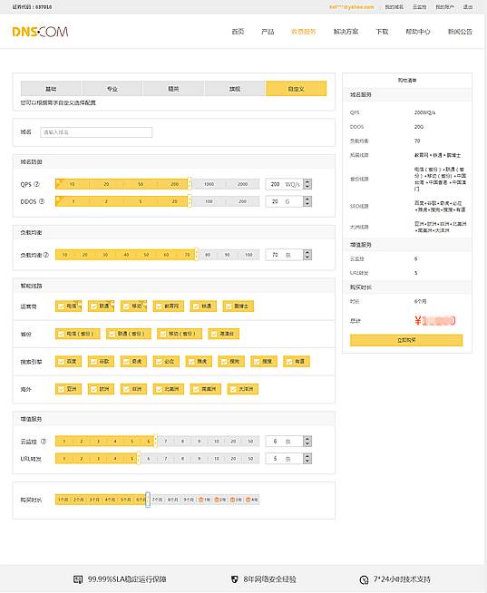 此模式下有域名防御,负载均衡,智能线路,增值服务,购买时长。根据网站需求选择不同模块服务。选择完成后可以看到清晰的购物清单,提示你购买的总价格与各项服务。