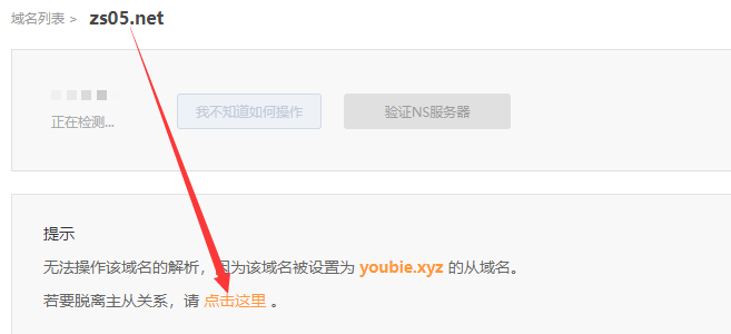 ①若想解除单个域名的克隆关系,先选定需解除关系的从域名,点击“点击这里”页面跳转后再点击“脱离按钮”即可解除该从域名的克隆关系,且其余从域名克隆关系不受其影响。