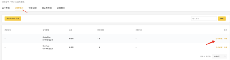 购买完成以后就需要登录到帝恩思控制台-SSL证书-OV EV证书管理,对SSL证书进行域名绑定与企业信息填写。