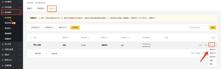 等待模板审核通过后,点击【域名服务】,选择【域名管理】,选择【未实名】列表,找到未实名域名。点击右侧【更多】按钮,选择【模板过户】。模板过户完成以后域名实名认证也就认证完成,可以开始域名解析了。