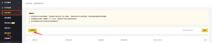 域名注册完后,点击【控制台】按钮,进入管理后台。点击左侧导航栏【域名服务】,选择【模板管理】,点击【新建模板】,按照系统提示完成基础信息填写。点击【保存】按钮提交实名认证。