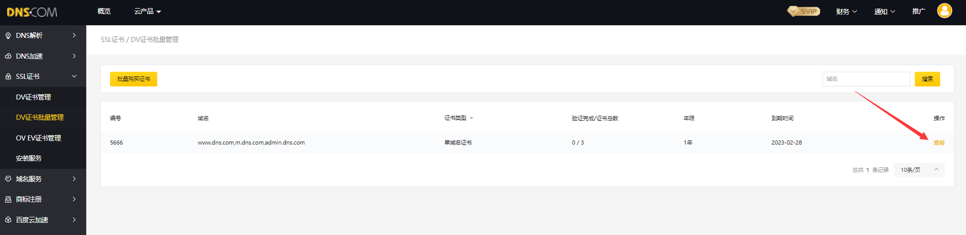 4、购买完成后【进入控制台】点击「SSL证书」选择「DV SSL证书批量管理」可以看到刚刚批量申请的证书任务,选择「查看」可看SSL证书具体任务详情。