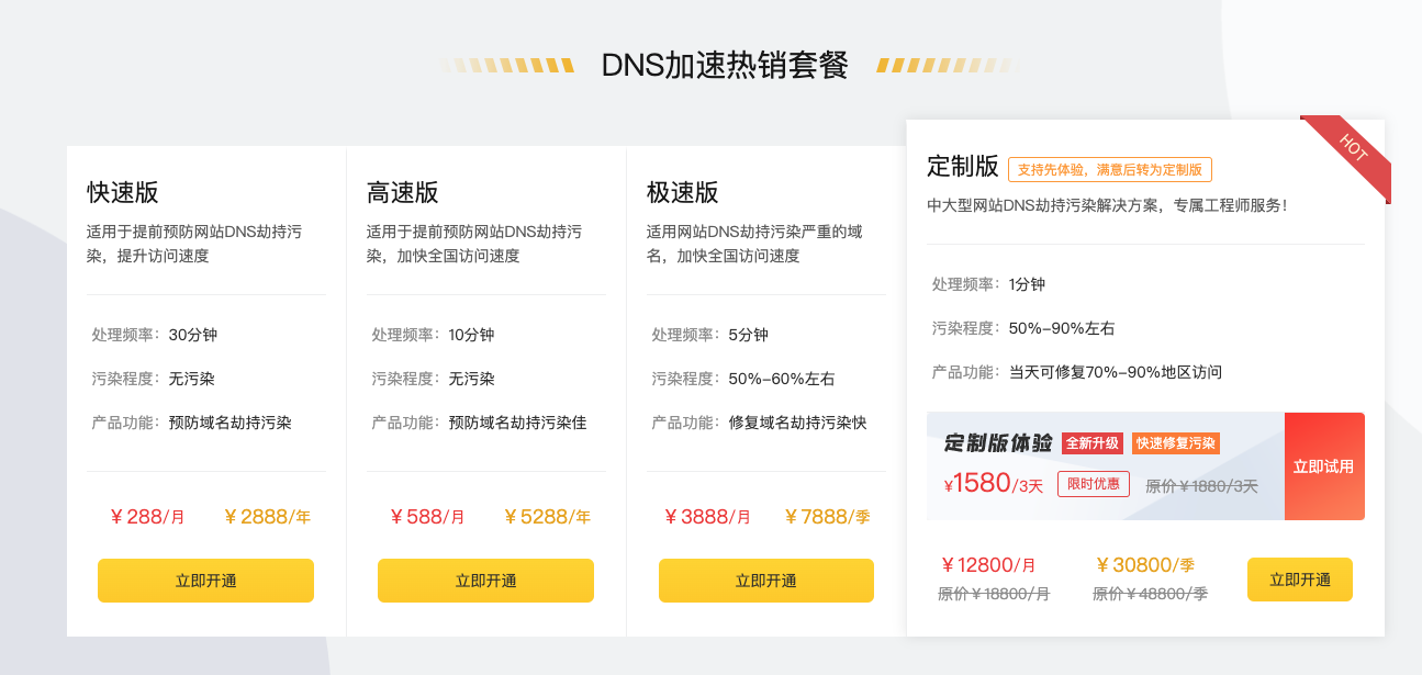 1、首先需登录www.dns.com官网,进入DNS加速介绍页,选择您需要购买的套餐。