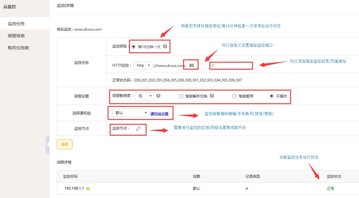 根据上图所示及提示,添加设定监控任务详细规则,添加完成后点击保存,该云监控任务即正式添加启用成功。