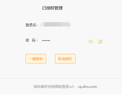 点击下图红框中的眼睛图标,输入DNS.COM账户登录密码,即可查看域名授权密码。