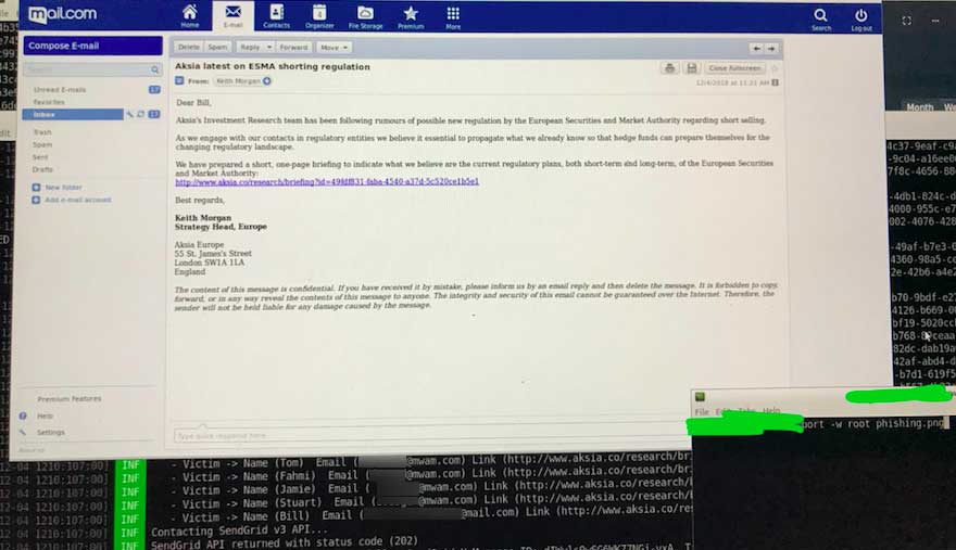 还包括作为证据的是网络钓鱼活动电子邮件的示例,其中打开的窗口显示了执行网络钓鱼工具包的命令。